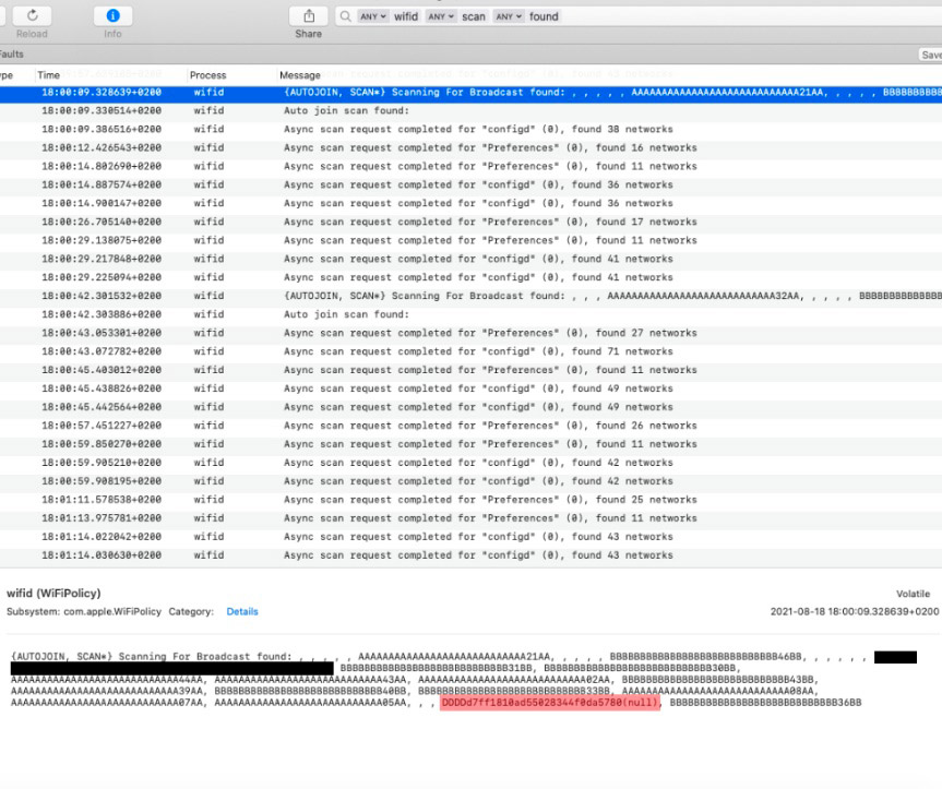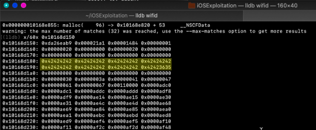 However, not through ROP, since we couldn’t find any gadgets suitable for ROP within the wifid binary itself. JOP would be required to exploit this vulnerability if a control of the execution flow is in fact possible, and the JOP payloads should also be part of the AP spray. KASLR is still a problem though, but the one thing we found useful is that when the logs (available on XCode) print the AP names, and when it tries to print the malicious SSID, it replaces the “%x” escape characters with actual addresses, thus causing a memory leak. This happens only when the malicious SSID is part of the spray and is not an individual hotspot. So technically if you need to get an address, you can make multiple SSIDs and spray them to leak memory addresses.