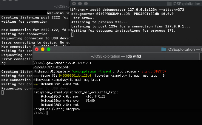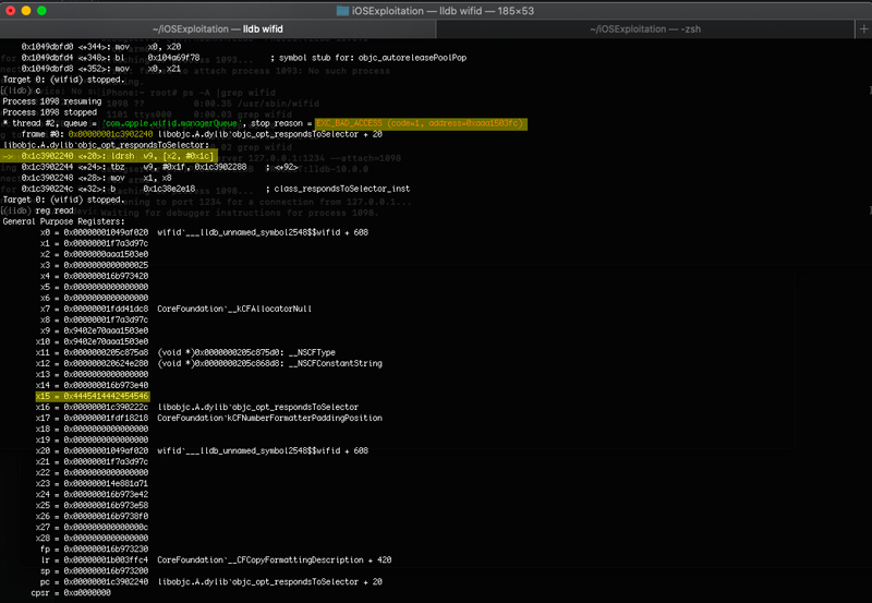 Now that we had my SSH connection, we had to setup the debug environment. For this we used lldb on the Mac mini, and debugserver on the iPhone, which can be installed with Cydia. Then, we just had to use debugserver, and attach the correct PID (the process name is wifid) to start the listener. Note that if the wifid service stays idle to long because of the debugging process, the iPhone will reboot by itself which sometimes required me to repeat the jailbreaking process. What was left to do, was to execute the gdb-remote command on lldb to start the debugging session.