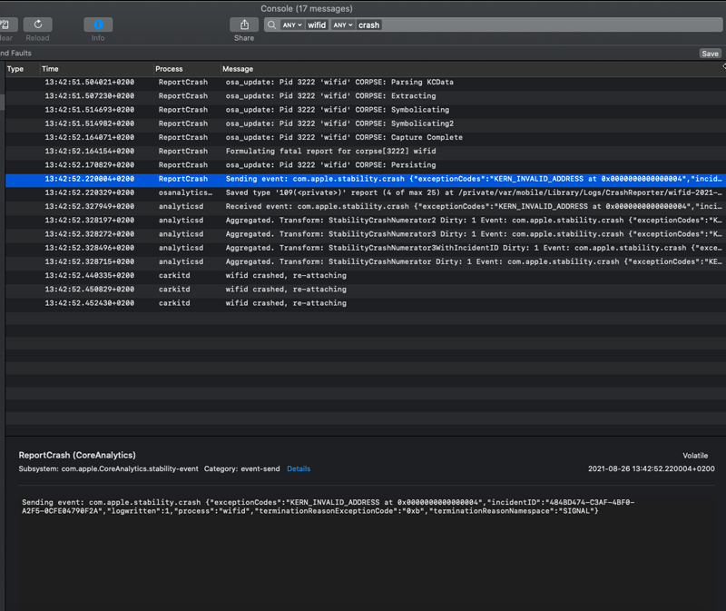 XCode’s console – wifid crash logs