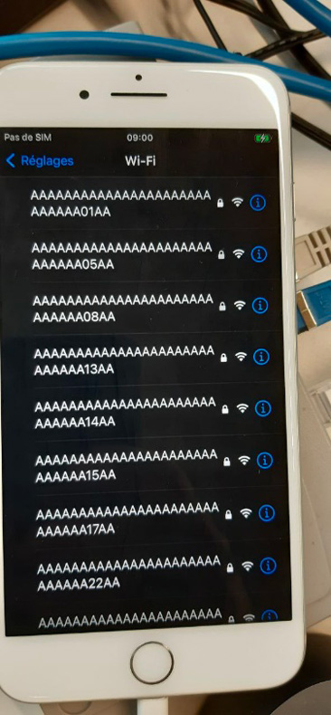 The Zecops team came up with a great idea on how to possibly control the stack and there for entry to control the code execution flow. Basically, they used a be a con flooding attack [3] that broadcasts hundreds of access points. Thanks to this, these APs will appear on the iPhone and possibly on the stack. I have reproduced this technique by using airmon-ng to setup the monitor interface, and mdk3 with a list of multiple SSIDs to start the flooding.