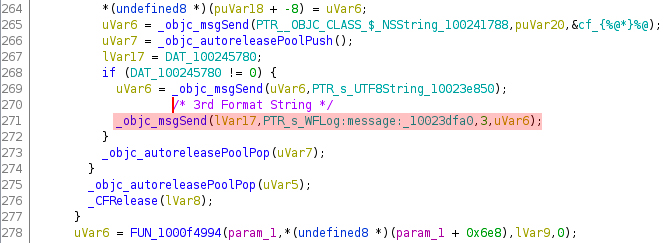 On the second _objc_msgSend()call, there is no format made thus causing a format string vulnerability. On a debugging aspect, this is where you want your break point to be placed. This function scans for the existing Wi-Fi networks in the area, and always runs even if the phone is locked. It’s the reason why if the RCE is accomplished, it requires no interaction from the user (zero click).