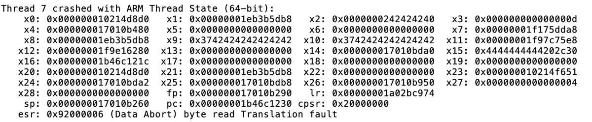 On the above screenshot we can easily identify the reason of the crash. Basically, the program tries to access the address that’s 28 bytes further from the address contained in x2, and crashes because this address doesn’t exist.