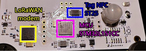 The circuit consists of an STM32L151CC MCU, a LoRaWAN modem and an NFC tag from STMicroelectronics. For the NFC tag, the reference cannot be found on its exposed side after testing. The pinout appears to match the manufacturer's ST25 range.